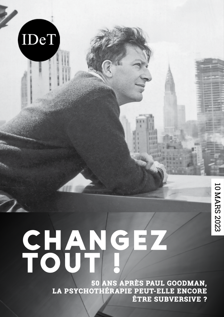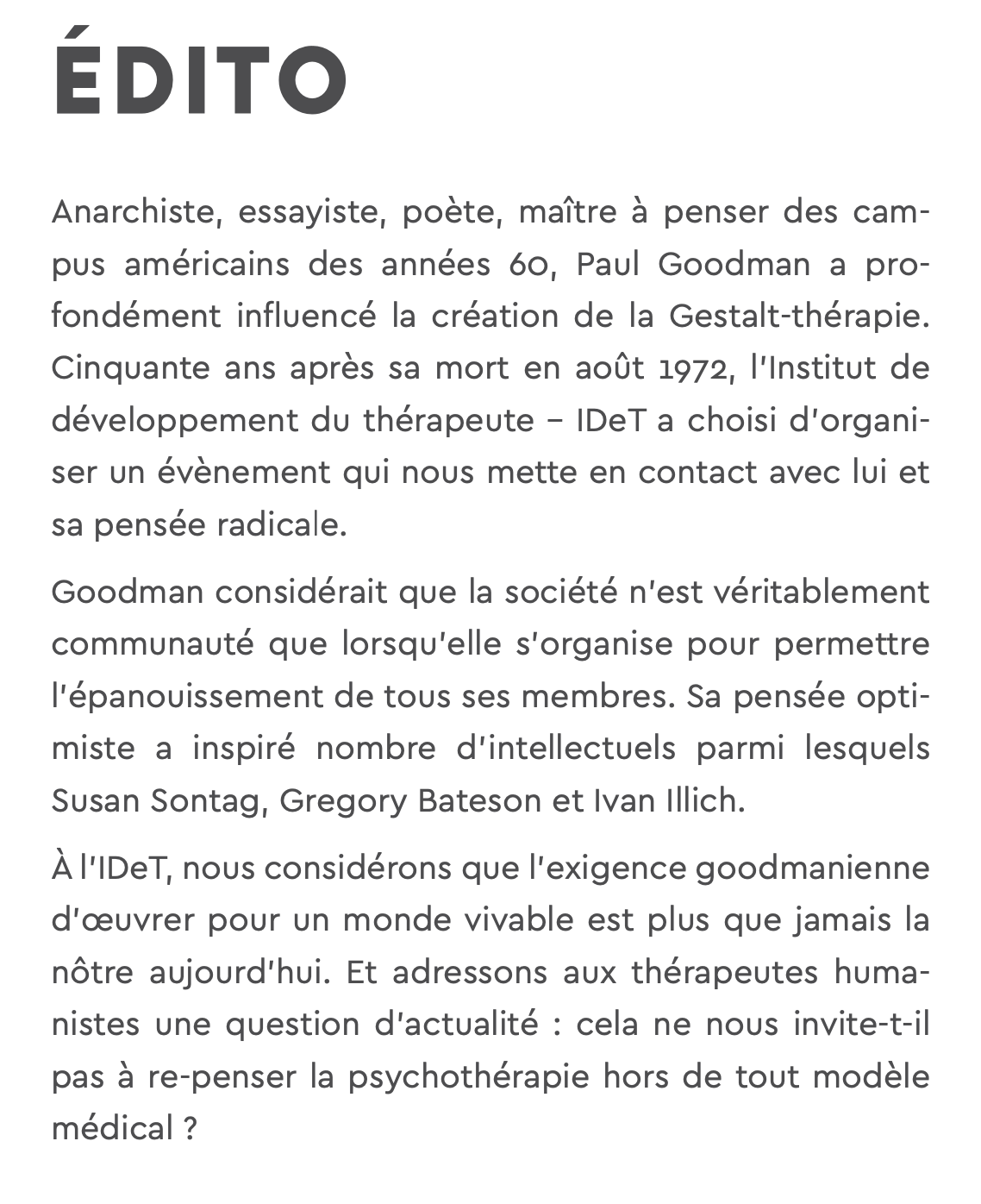 Commencée par un temps de rencontres informelles et de retrouvailles des participants, la soirée s’est poursuivie par une présentation de notre Institut de développement du thérapeute, l’IDeT et des raisons qui nous ont amené à nous centrer sur Paul Goodman. Du fait du cinquantième anniversaire de sa mort, certes, mais aussi parce qu’il était tout entier animé par le désir d’une société plus libre et qu’en ces temps actuels de conformisme et de durcissement des rapports sociaux, son regard radical et libre est plus que jamais nécessaire.