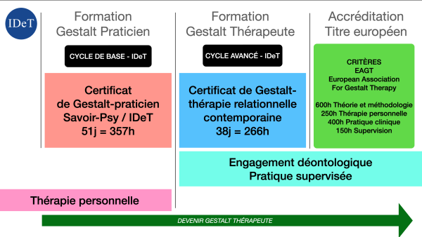 Après avoir proposé des modules d’approfondissement puis mis en place le Certificat de Gestalt-thérapie relationnelle contemporaine, l’IDeT s’est aujourd’hui associée à Savoir-Psy pour proposer le socle de base qui conduit au niveau de Gestalt-praticien.